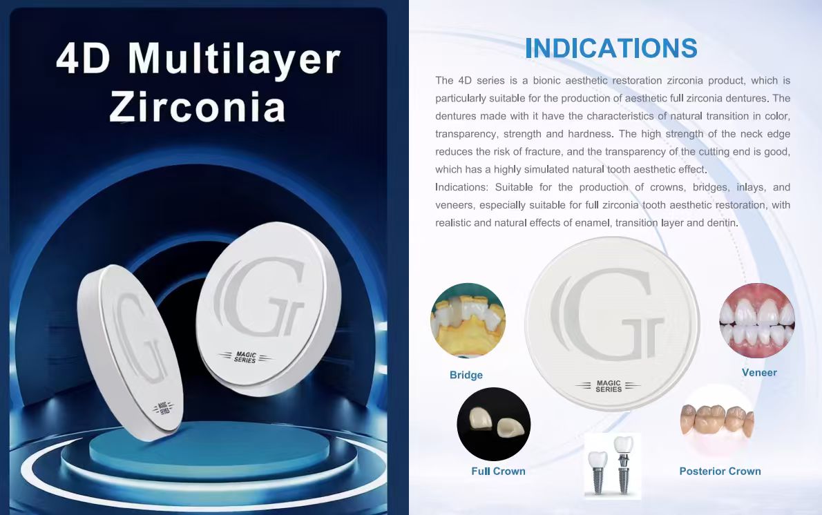 The 4D series is a bionic aesthetic restoration zirconia product, which is particularly suitable for the production of aesthetic full zirconia dentures.